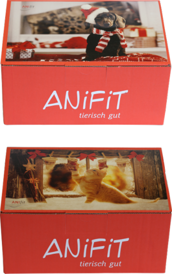 Auch Hunde und Katzen freuen sich über Abwechslung und Überraschungen. Die Anifit-Weihnachtsbox ist eine attraktive Geschenkbox mit acht verschiedenben Leckerlis: